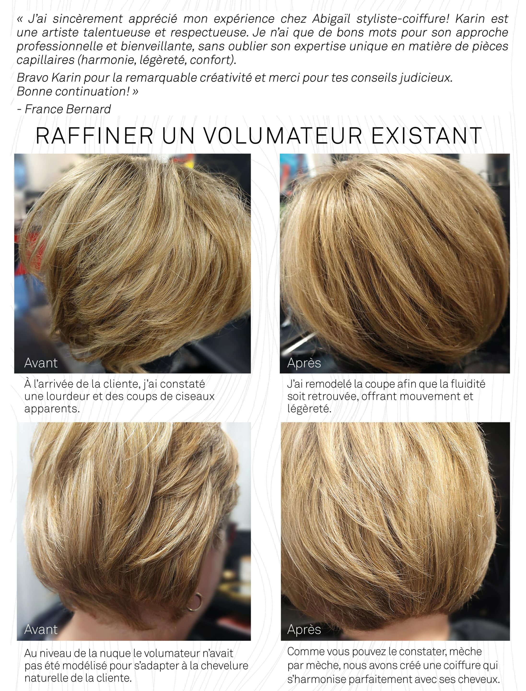 Je vous présente mon approche et la qualité de nos passerelles. Plus délicate et plus harmonieuse qu’un volumateur standard, la passerelle s’ajoute discrètement à votre chevelure. Confectionner avec des cheveux humains, selon mes critères, elles sont légères et confortables. Je vous présente l’aspect artistique des techniques de coloration et de coupe qui offriront une parfaite fusion de la passerelle avec votre chevelure. Il n’y a pas de frais pour cette première rencontre qui ouvre la voie à une meilleure compréhension l’une de l’autre.